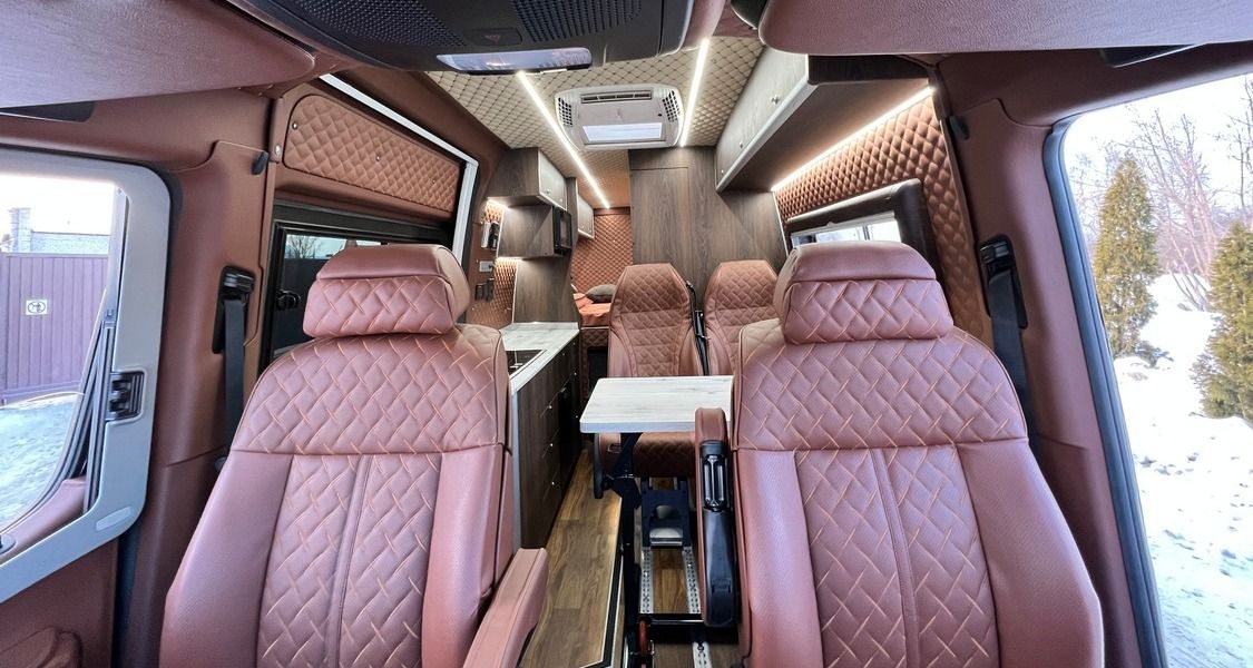 Цена зависит от желаемого уровня комфорта (от эконом до VIP). Мы можем установить просторные сиденья-кровать, сделать столики, оборудовать салон современной аудио-видео-техникой, мини-холодильником. Так гораздо удобней путешествовать, отдыхать, ездить на пикники и просто на шоппинг.